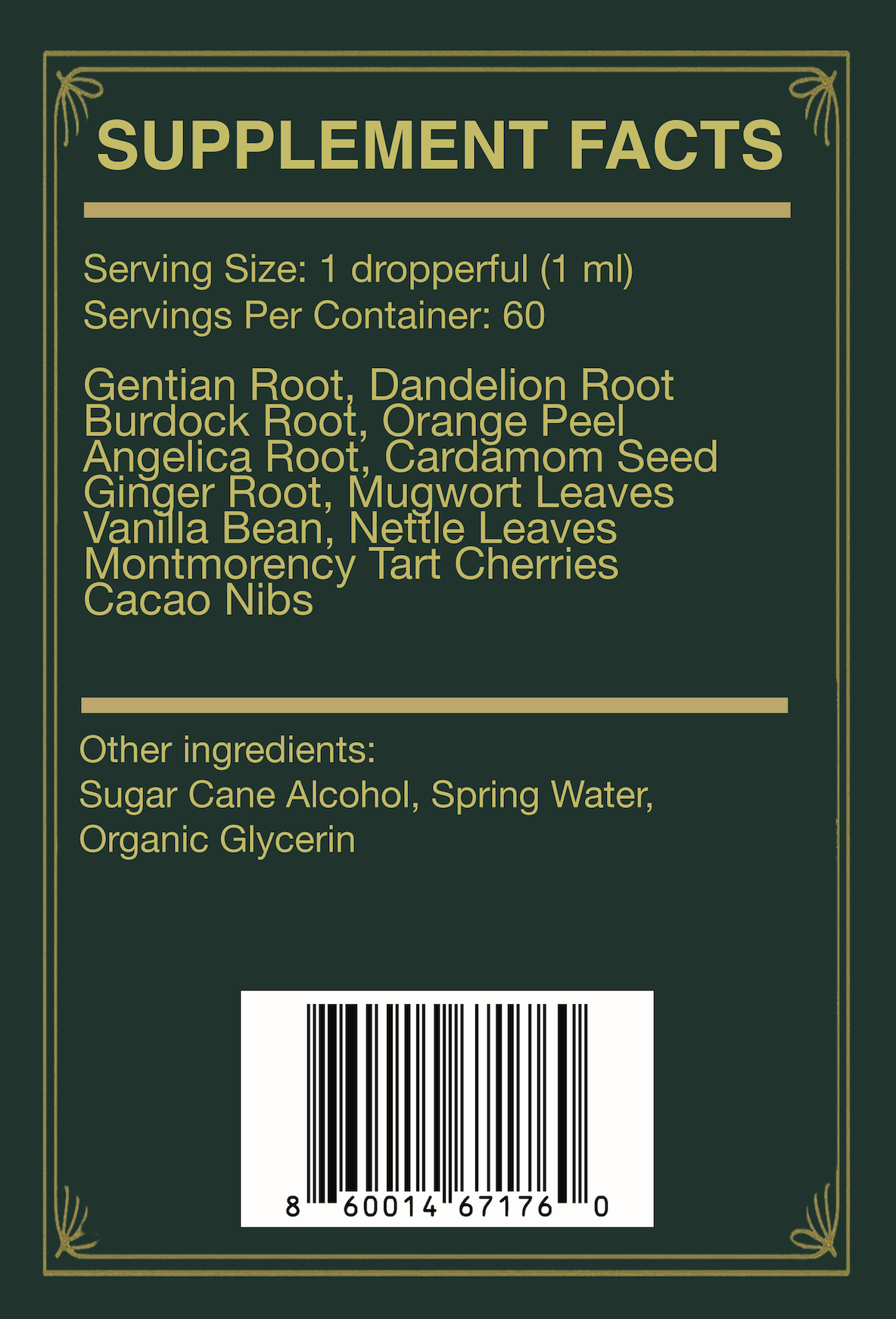 Bitter Belly is a grounding digestive tonic crafted from time-honored bitter roots, aromatic seeds, and gentle botanicals that awaken digestion, balance appetite, and restore metabolic flow. At its foundation is a dual-extracted blend of dandelion and gentian — traditional allies for stimulating bile flow, easing bloating, and supporting liver vitality. Balanced with warming ginger, cardamom, and cacao, plus tart cherry and vanilla for depth, this elixir offers both function and flavor.