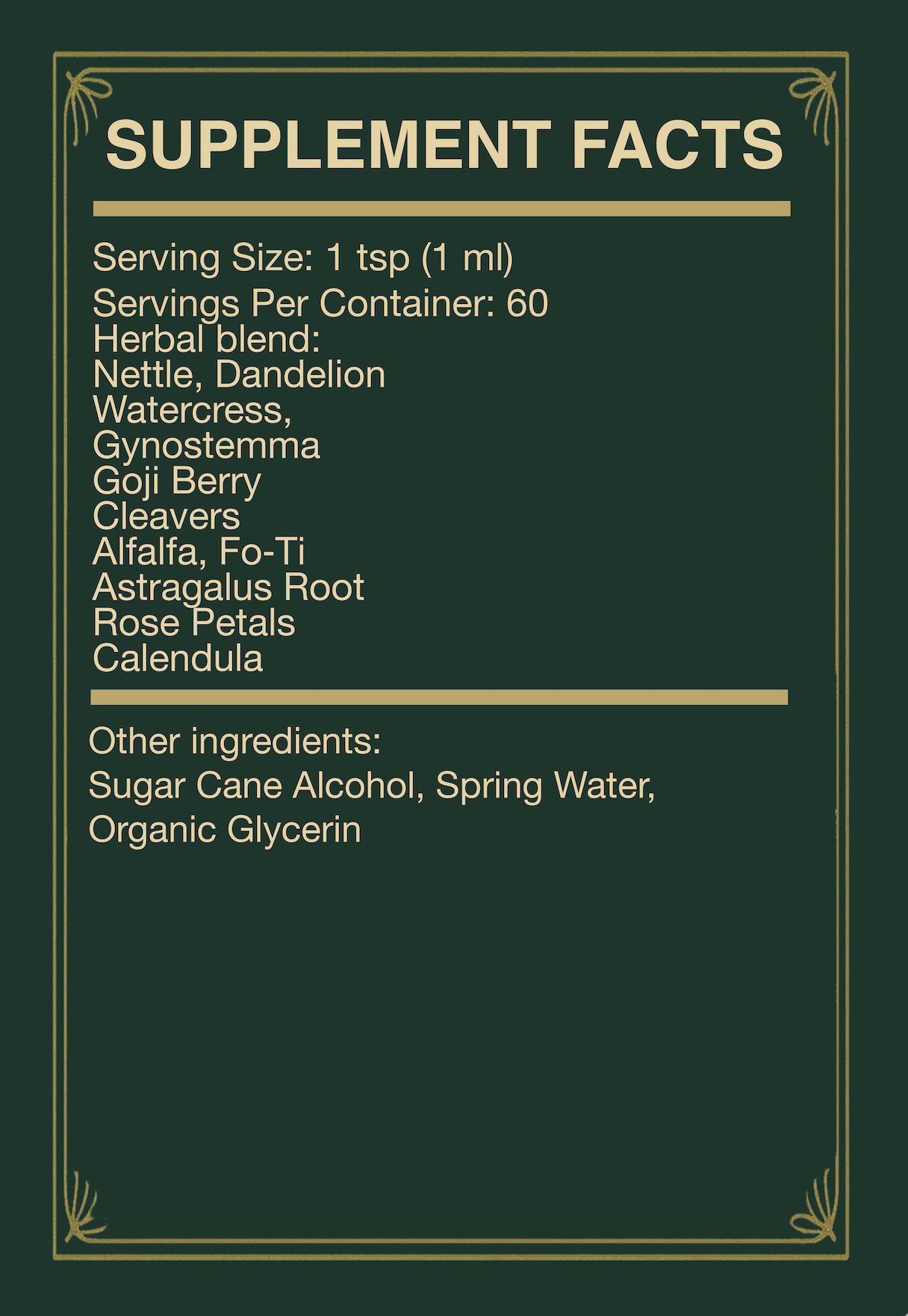 Daily Ritual is a mineral-rich botanical elixir crafted from tonic herbs, vibrant greens, and adaptogens — a daily infusion of earth’s nourishment to restore radiance and inner vitality. This formula combines nettle, dandelion, watercress, gynostemma, goji berry, cleavers, alfalfa, fo-ti, astragalus root, rose petals, and calendula — plants long cherished for supporting glowing skin, strong hair, gentle detox, and sustained energy.